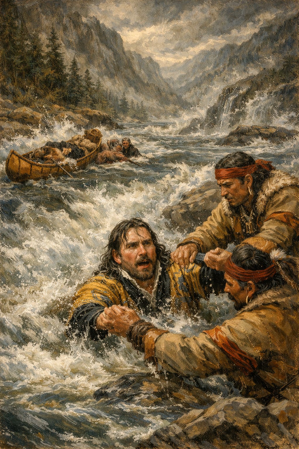 Sur la rive, les deux Algonquins l’attrapent par les bras.